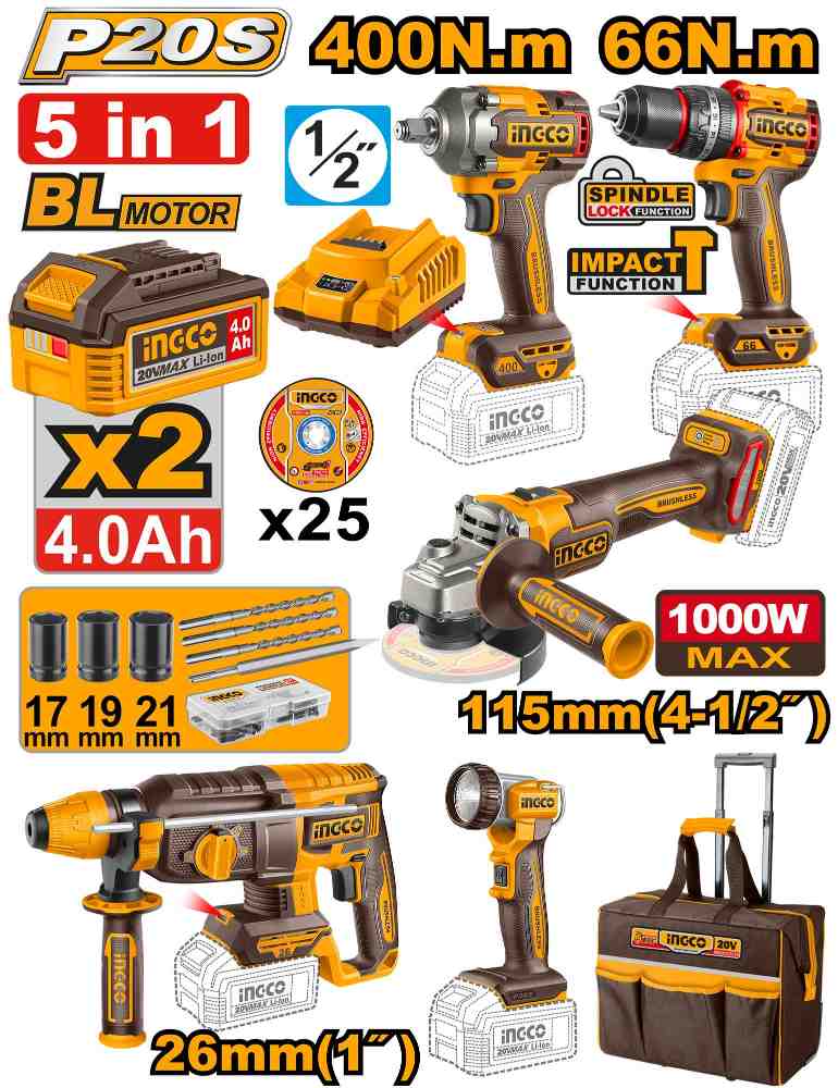 مجموعة مقدح شاكوش بطارية براشلس 20 فولت احترافي مع فرد شد وروتري وصاروخ وكشاف و2 بطارية ليثيوم 4.0Ah وشاحن (47 قطعة)
