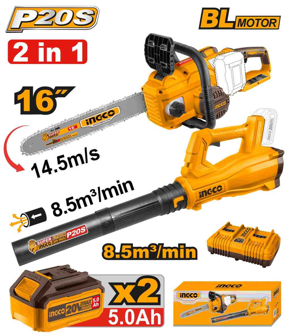 مجموعة منشار جنزير 20 فولت احترافي مع منفاخ و2 بطارية ليثيوم 5.0Ah وشاحن (2 قطعة)