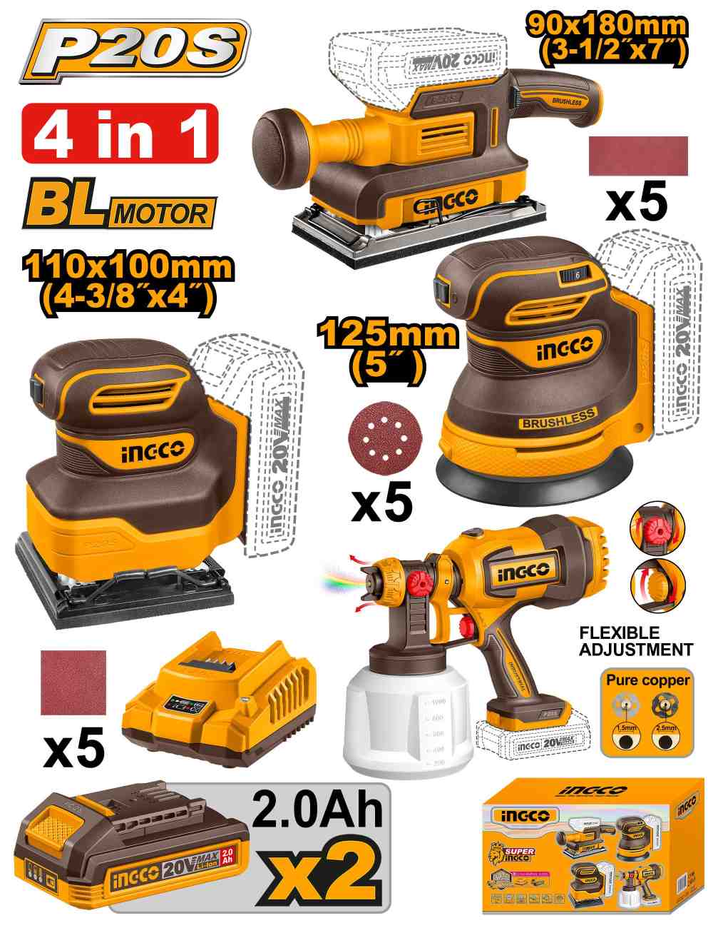 مجموعة حفافة تشطيب 20 فولت احترافي مع حفافة وحفافة مدارية وفرد رش و2 بطارية ليثيوم 2.0Ah وشاحن (4 قطعة)